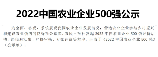 据悉,中国农业企业500强评选是由农民日报社发起的重要新型农业经营主体发展评价活动,本次参照国际通行评价办法,由企业按照要求进行申报或采用公开数据,参考利润和企业信誉等数据,依据2021年农业企业营业收入排序产生,是社会各界观察农业经营主体发展和乡村产业振兴的重要窗口。